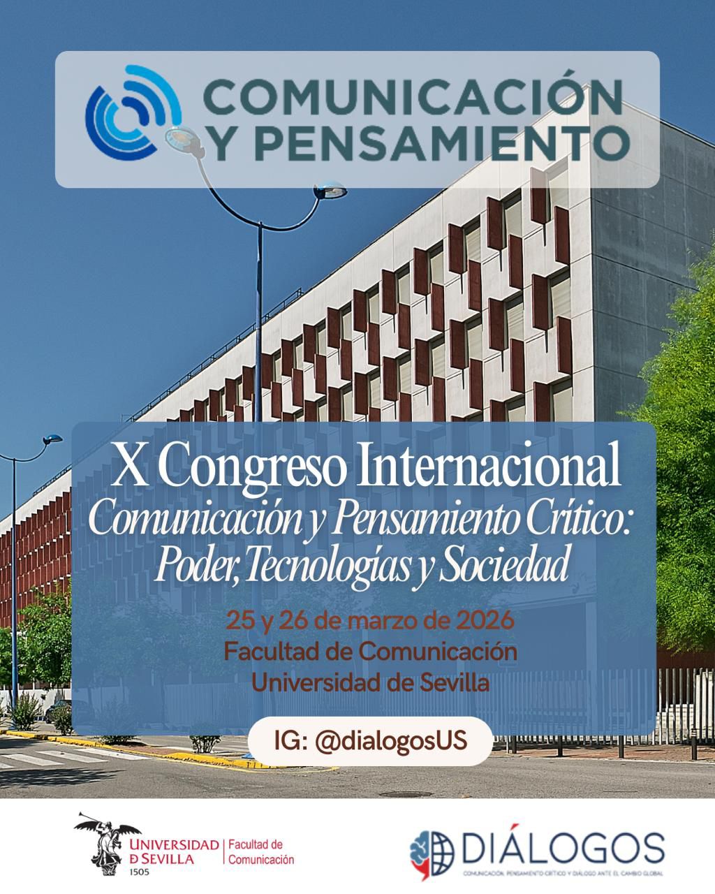Los días 25 y 26 de marzo de 2026, la Facultad de Comunicación de la Universidad de Sevilla será sede de la décima edición del Congreso Internacional Comunicación y Pensamiento Crítico, que en esta edición lleva por título “Poder, Tecnologías y Sociedad”.