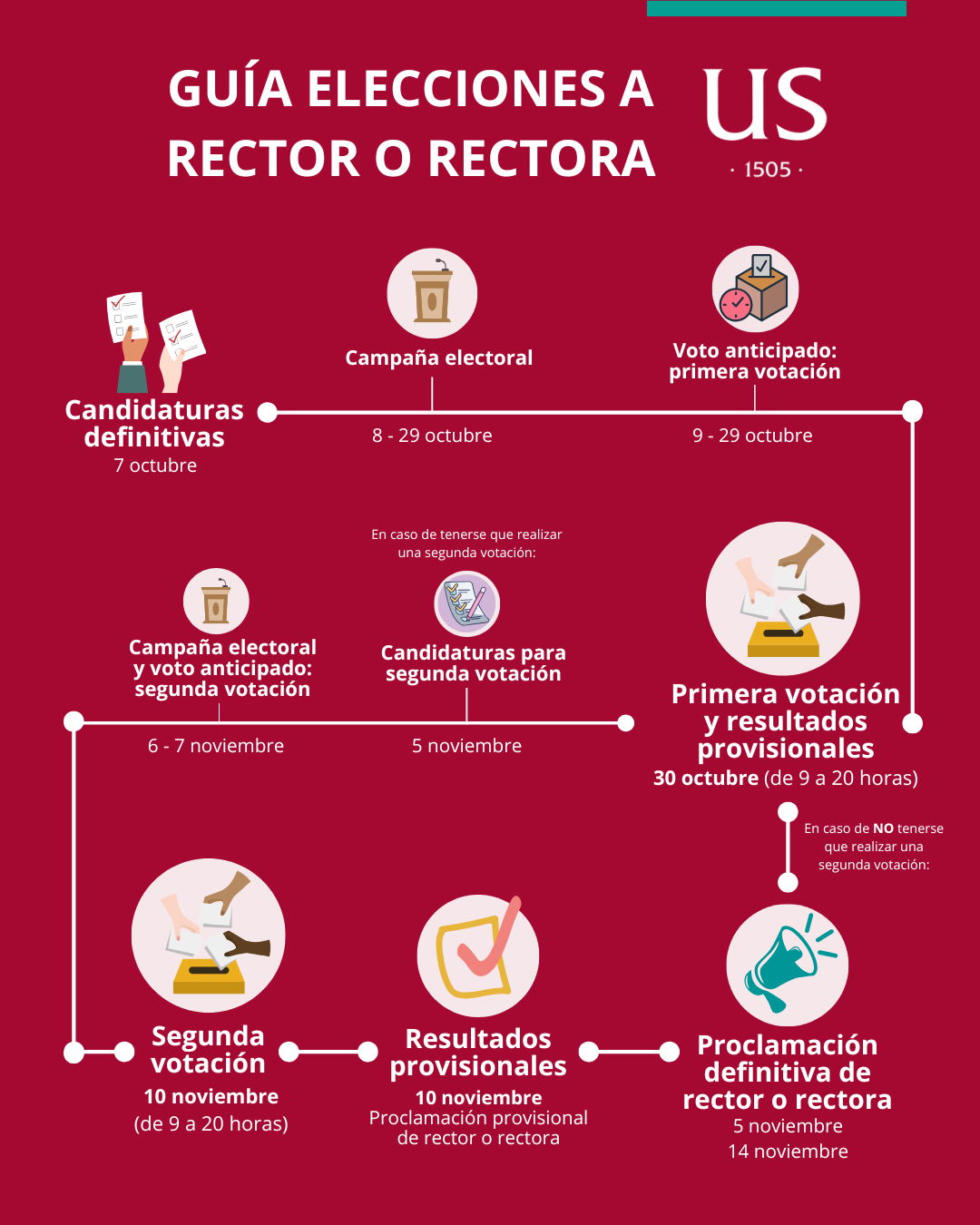En este espacio se recoge toda la información oficial relativa al proceso electoral para la elección de rector o rectora de la Universidad de Sevilla. Aquí se podrán consultar las novedades y comunicaciones que se vayan publicando a lo largo del procedimiento, así como cualquier información relacionada con el proceso electoral.